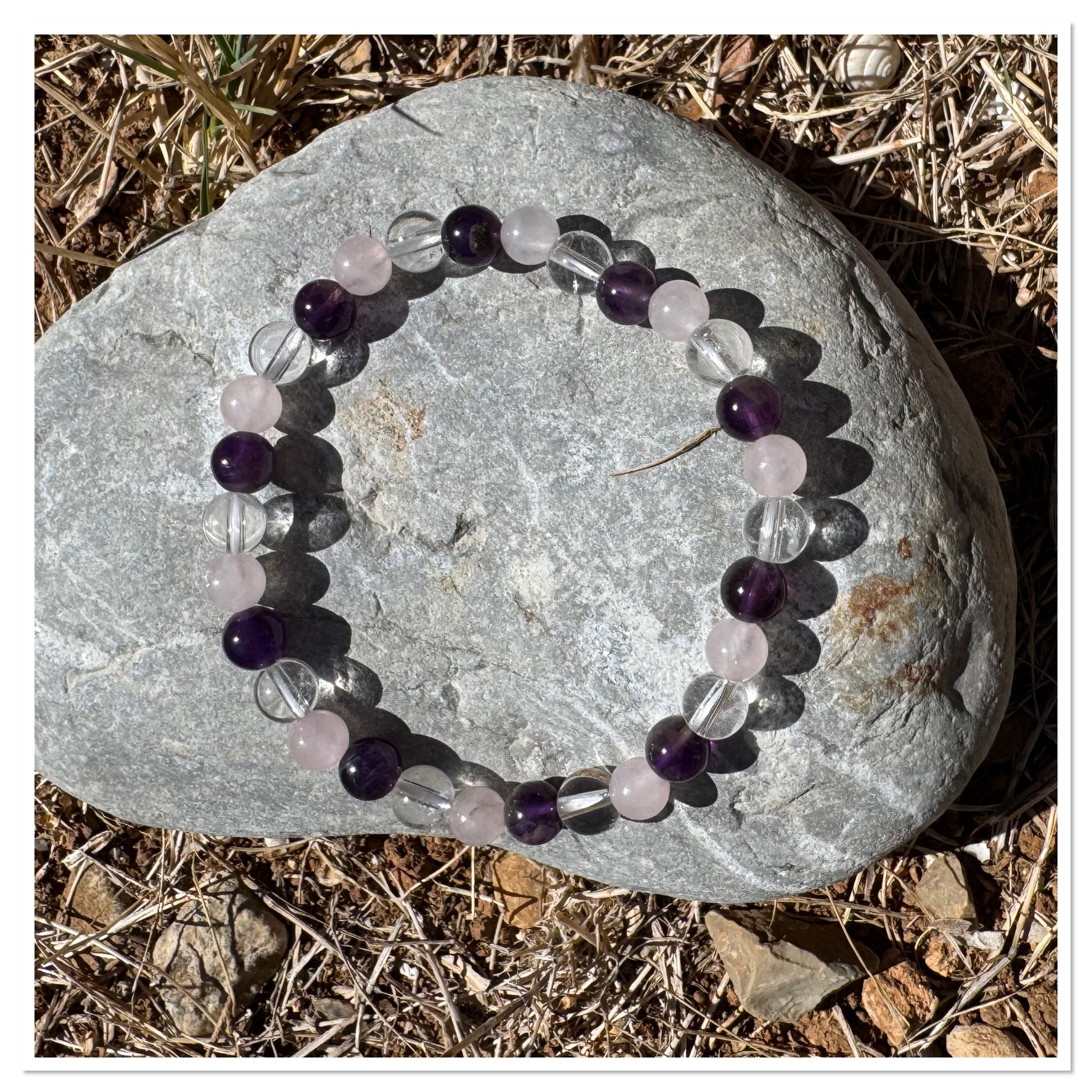 Bracelet mixte Améthyste, Cristal de roche et Quartz Rose 6 mm